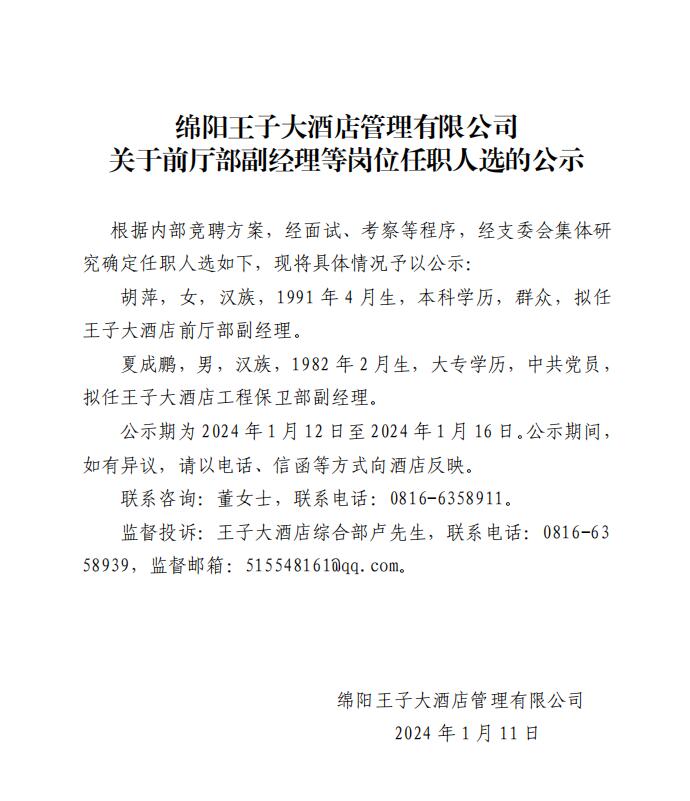 绵阳王子大酒店管理有限公司 关于前厅部副经理等岗位任职人选的公示