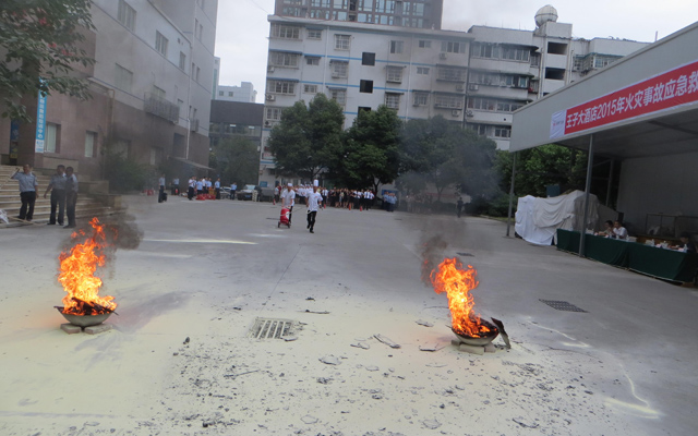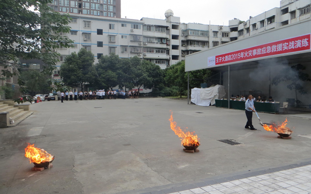 本次消防实战演练内容主要涵盖:一是分部门开展了全员火灾事故应急救援实战演练;二是针对新员工、重点岗位员工及租赁点人员,举办了油盆灭火及消防水带连接实战演练。上午9:30分,阳光和煦,烈日炎炎,在安委办的整队下,随着指挥长一声令下,2015年王子大酒店消防实战演练正式拉开序幕。首先绵阳市消防支队作战参谋范辉明讲解了扑灭初期火灾知识、逃生知识及使用灭火器材动作要领并进行示范,参加演练和观摩人员认真聆听,时而向范参谋请教学习消防知识,体现了酒店员工对消防工作的热爱;二是分组进行了油盆灭火演练,面对笼烟滚滚的熊熊烈火,演练队员沉着冷静,分别利用手提式、推车式干粉灭火器、石棉被快速直奔“火灾现场”,迅速有效将火扑灭。当演练进行到中途时,酒店领导亲自示范,并熟练的完成灭火演练后,场下爆发出热烈掌声,将演练活动推向了高潮。三是分组进行了消防水带连接,演练人员在指挥员下达口令之后,按照动作要领迅速连接了每一个消防水带接口,受到在场领导交口称赞。、