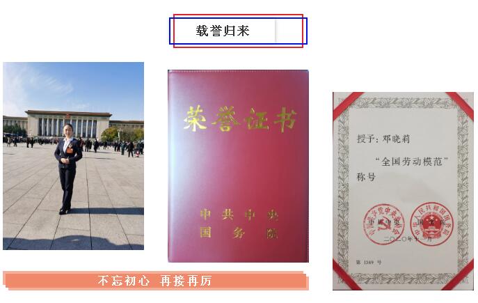 对于此次赴京参加表彰大会,邓晓莉同志非常激动,她表示:“获得这个荣誉是一种鼓励也是一种鞭策,同时也感谢各级领导对自己的关心关爱!感谢同事们多年的帮助与支持!今天的荣誉应该归功于集体,没有王子大酒店这样的好平台就不会成就今天的自己,在以后的工作中也会始终用“劳模”的标准严格要求自己,不忘初心,再接再厉!”